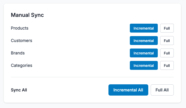 - Individual Entity: Click "Incremental" or "Full" next to Products, Customers, Brands, or Categories